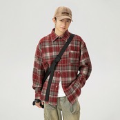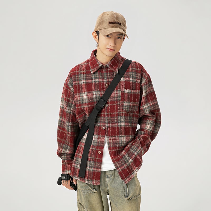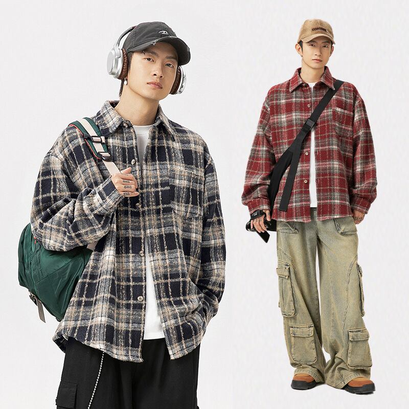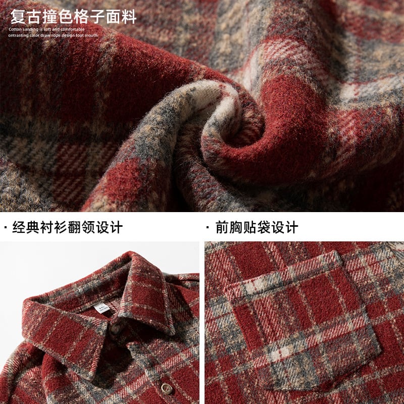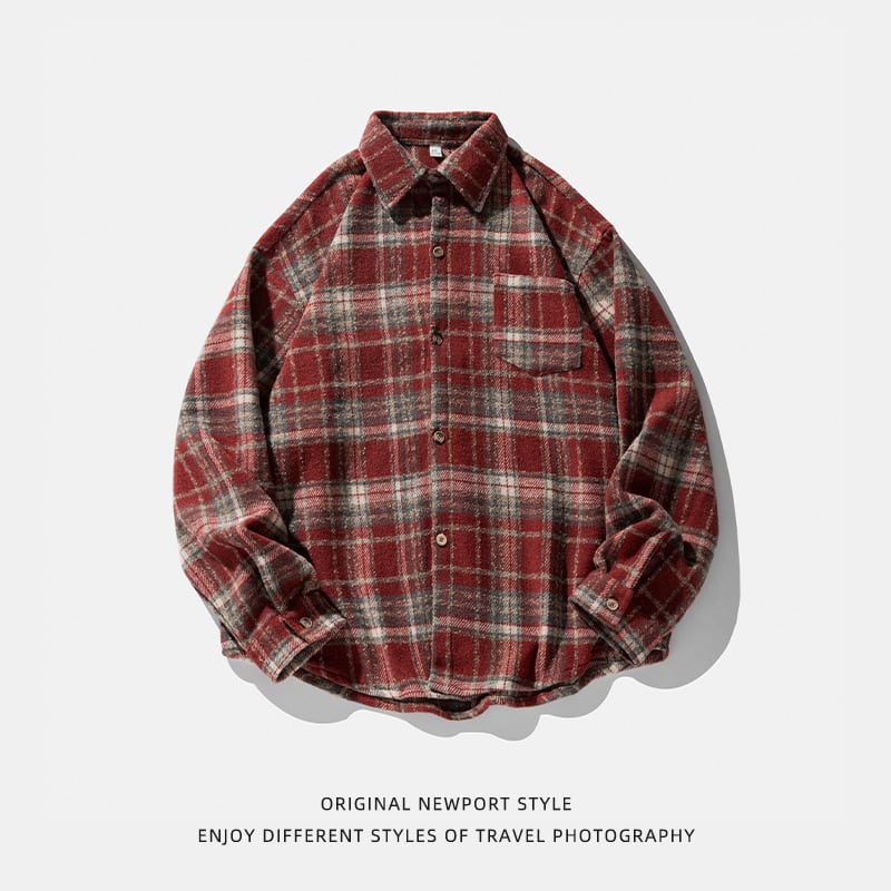 新作長袖シャツメンズ春ラペルポケット質感ルーズジャケット秋アメリカンレトロチェック柄220