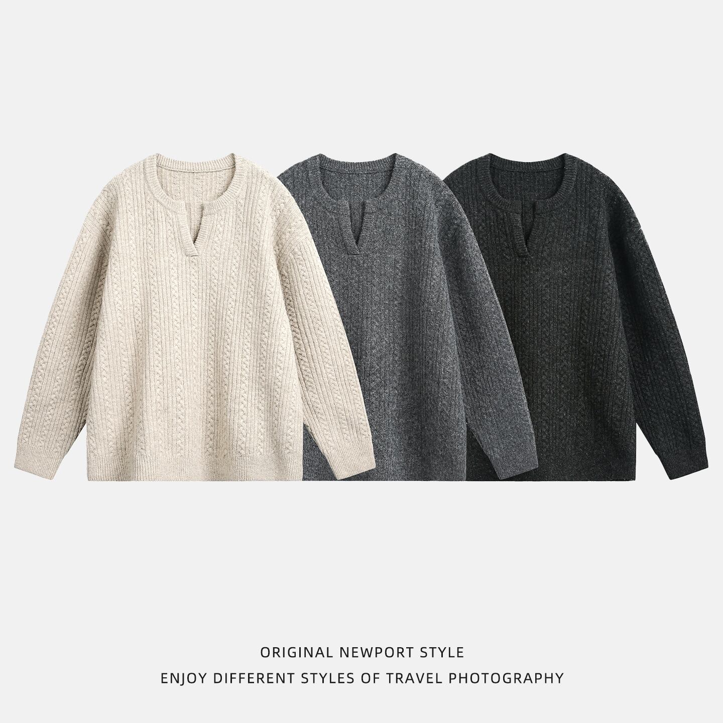 新作Vネックセーター秋冬メンズレトロケーブルニットゆったりプルオーバーセーター無地セータージャケット246