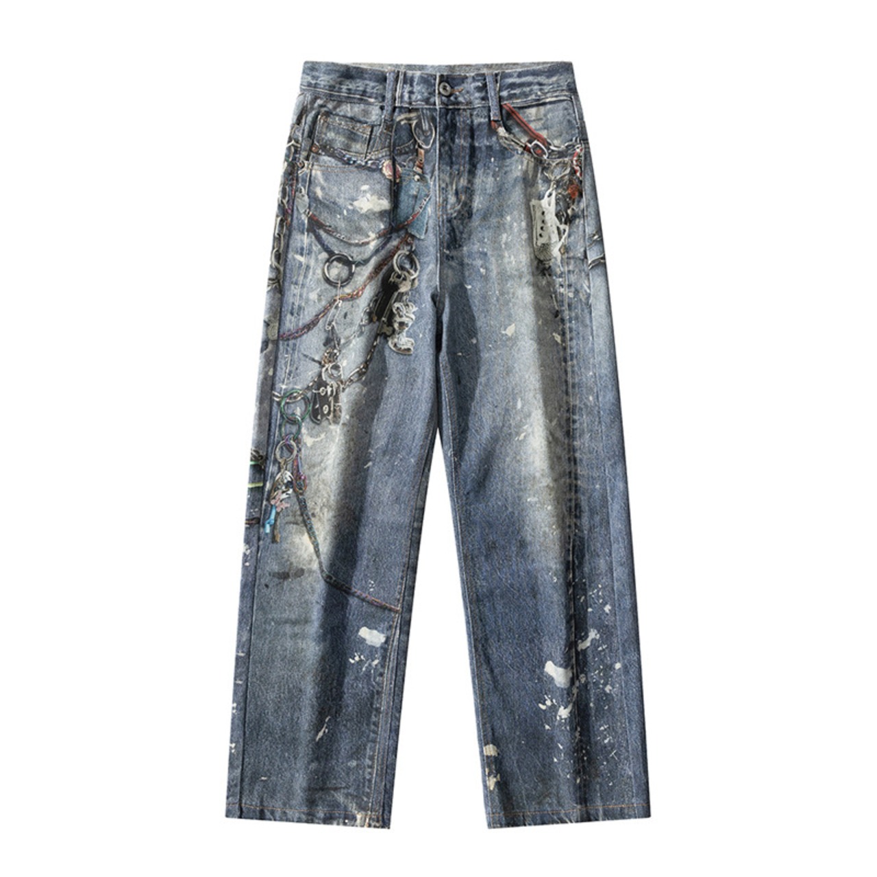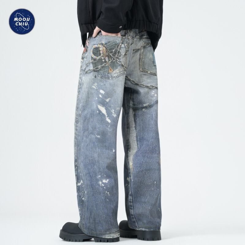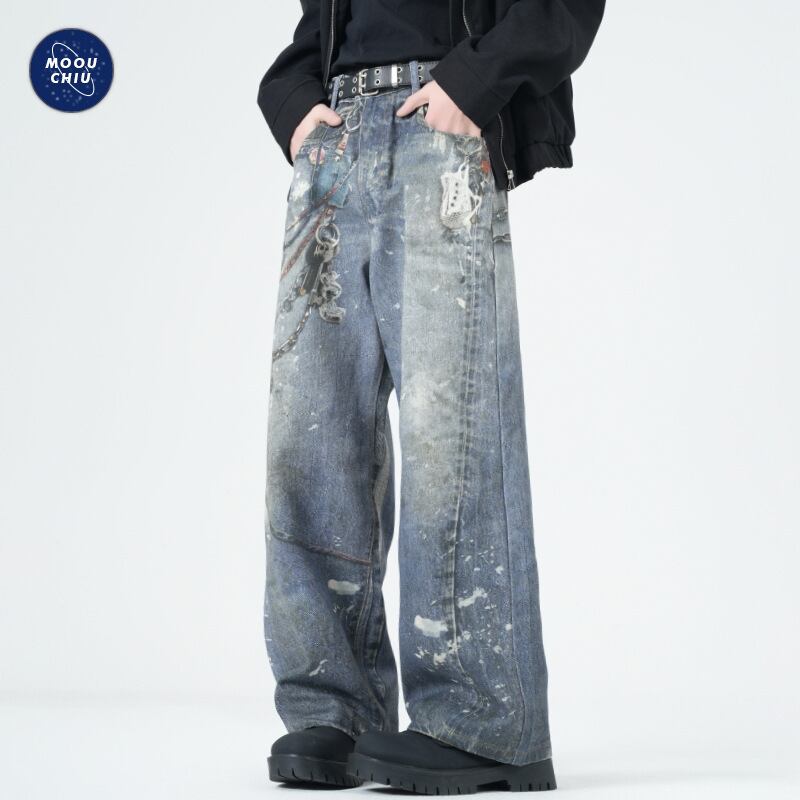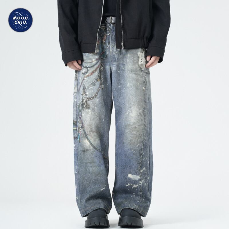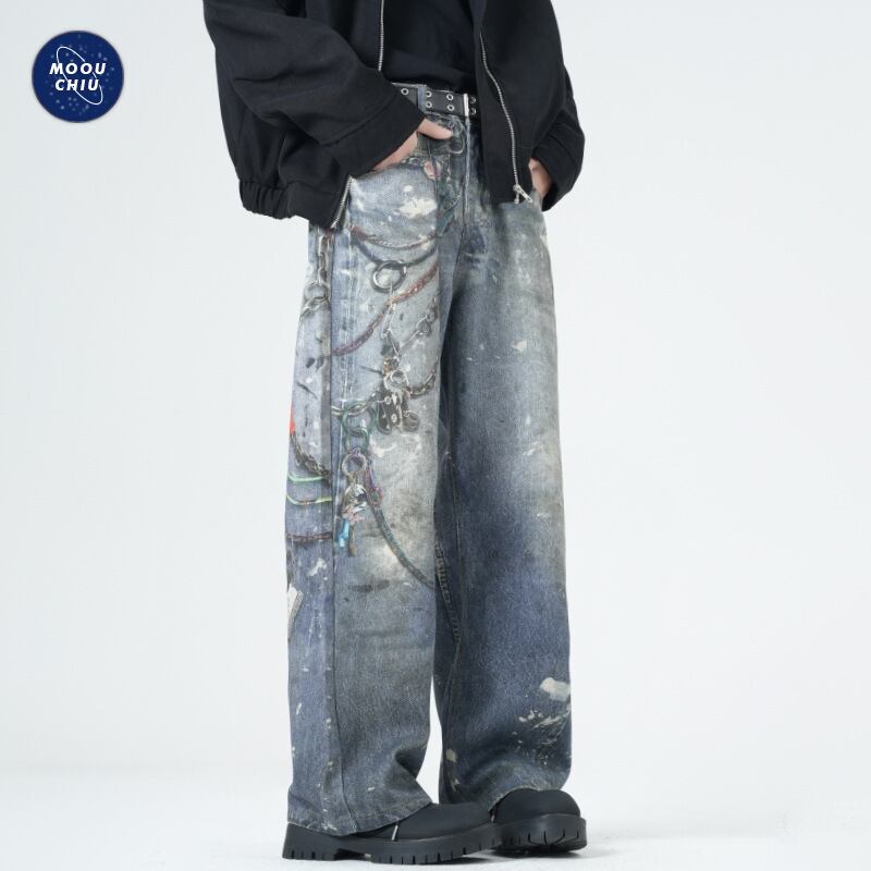 ワイドパンツアメリカプリントチェーンレトロジーパン男性ゆるいファッション463