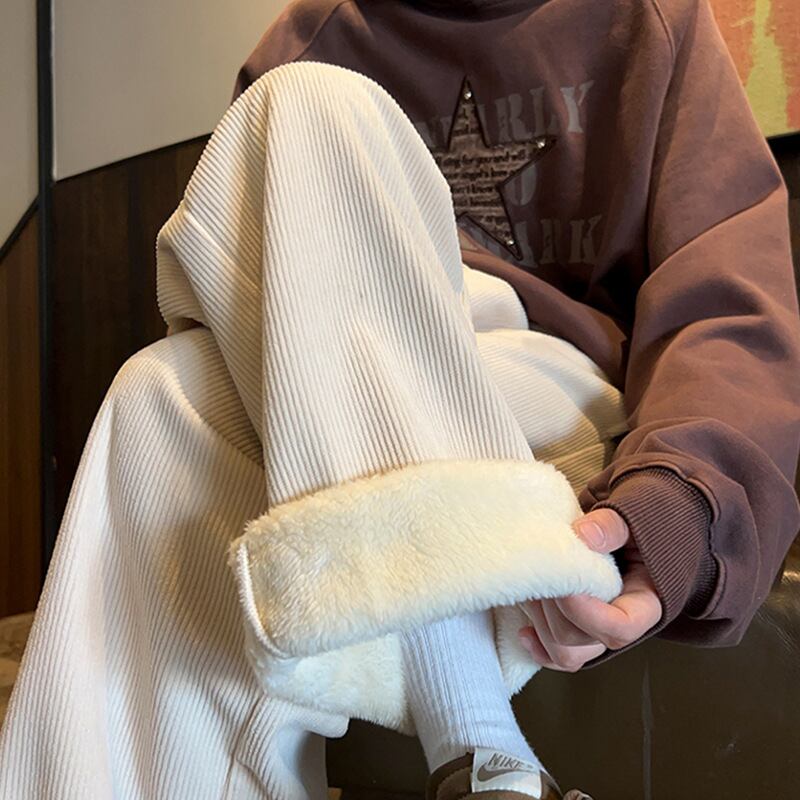 ・特厚な羊小毛とベルベットコーデュロイを使用した贅沢な質感が特徴で、冬のカジュアルスタイルにおすすめの一着です!リラックスしたワイドパンツシルエットが動きやすさを提供し、寒い日のお出かけも快適にサポートします。