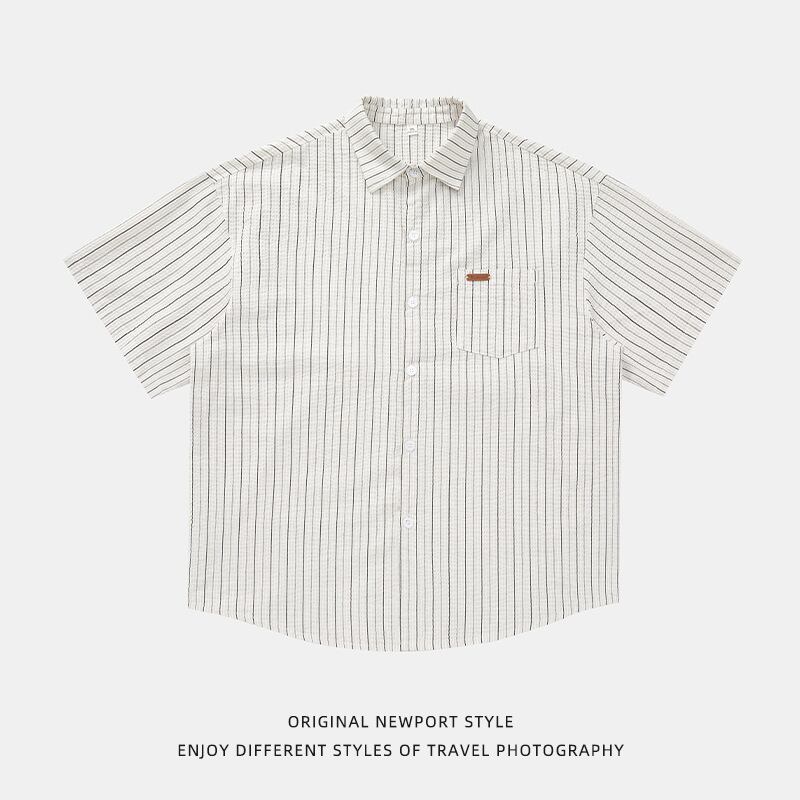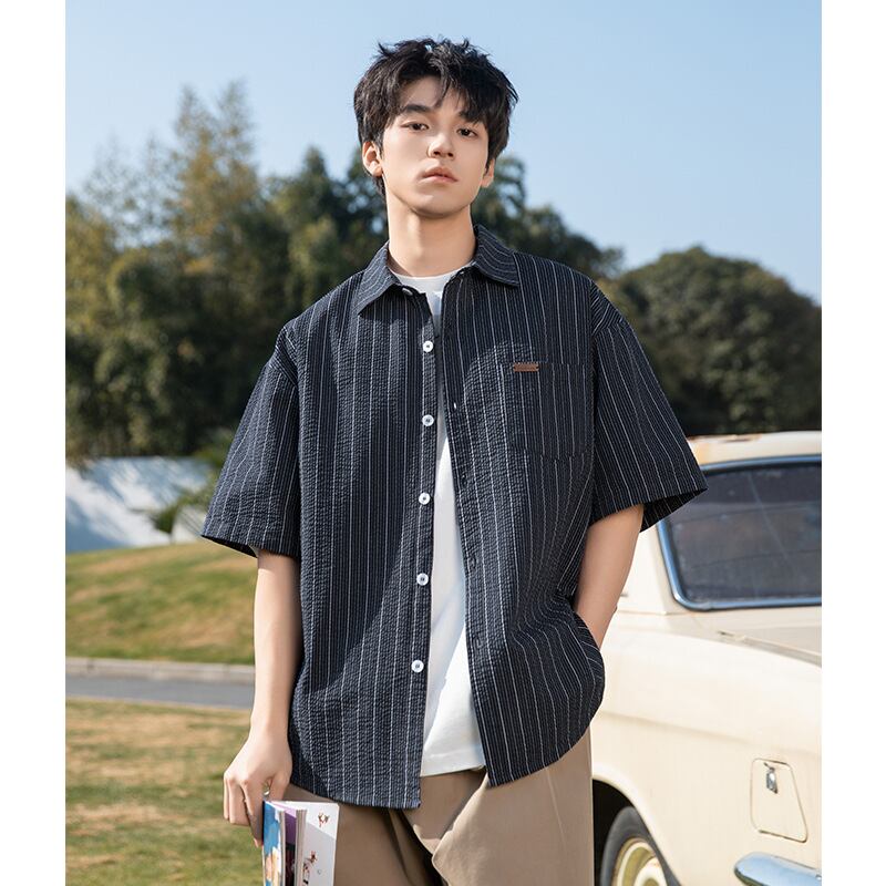 ストライプシャツ男性夏新作レトロカジュアルゆるい微シワ質感シャ 961