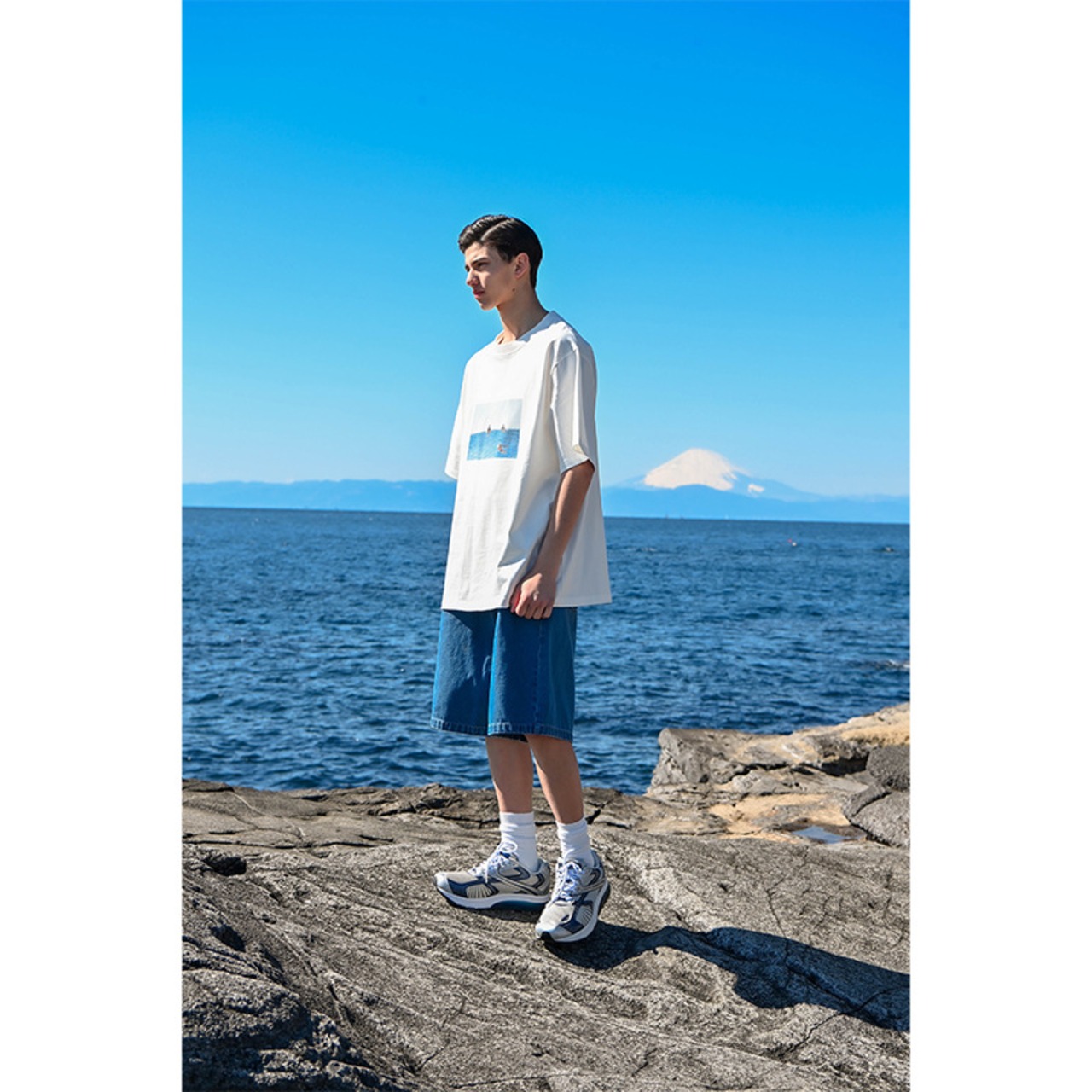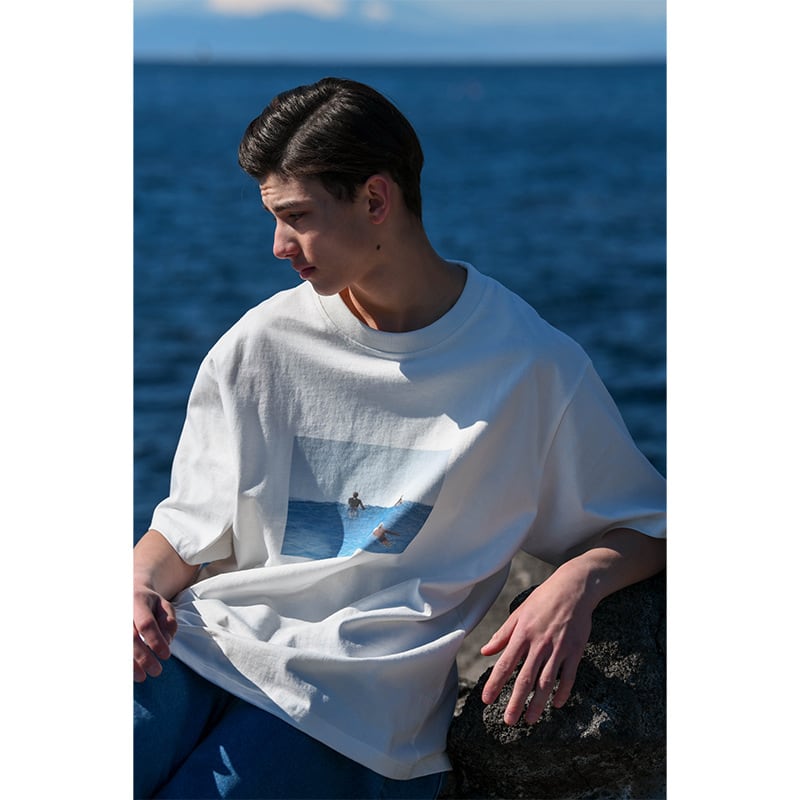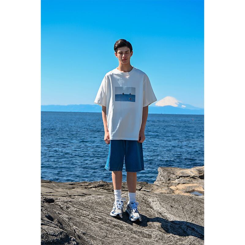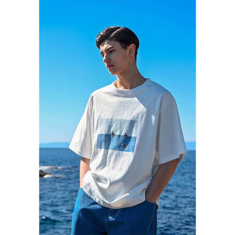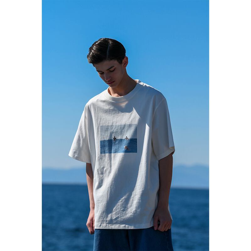 夏新型アメリカカジュアル海辺プリントコットン丸襟半袖男性 963