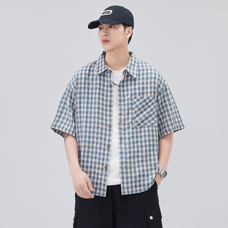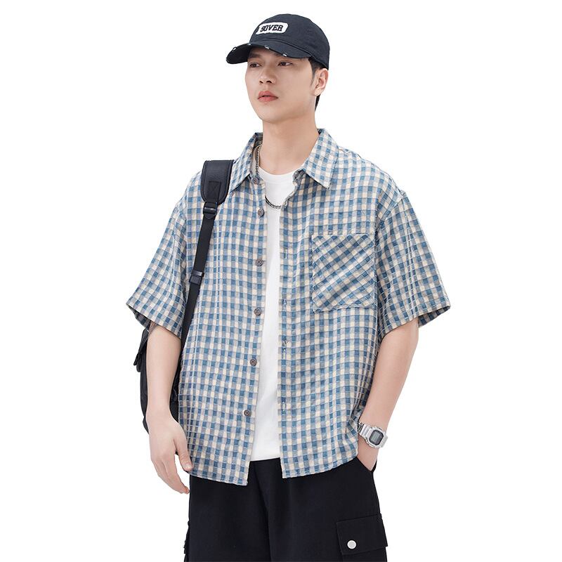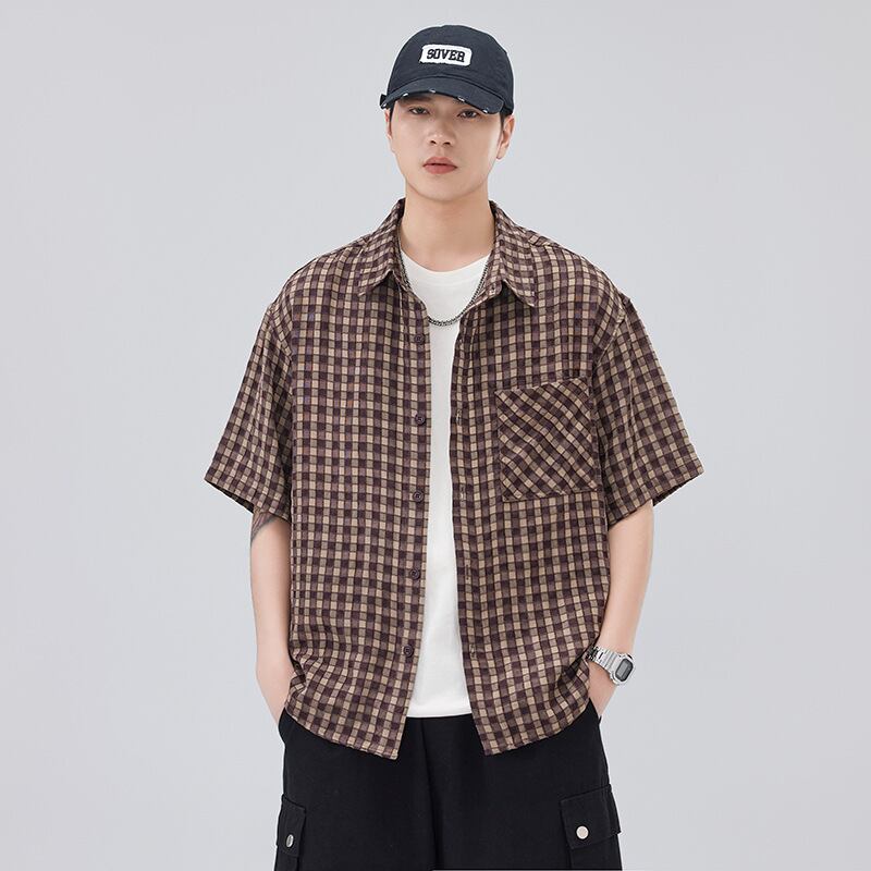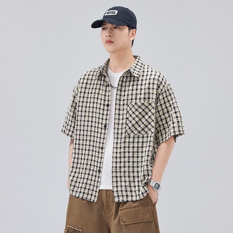 夏新型日系格子半袖シャツ男子ファッション 984