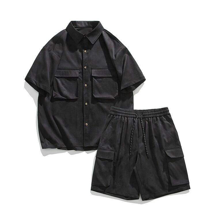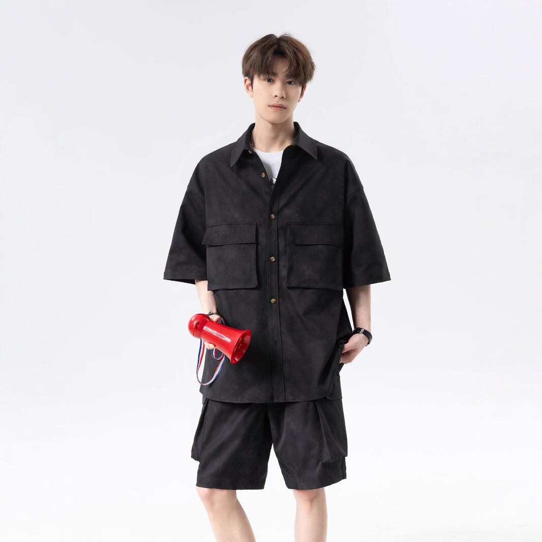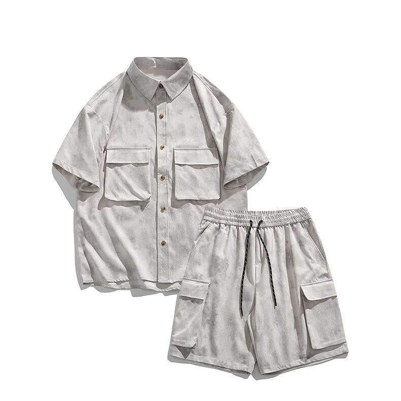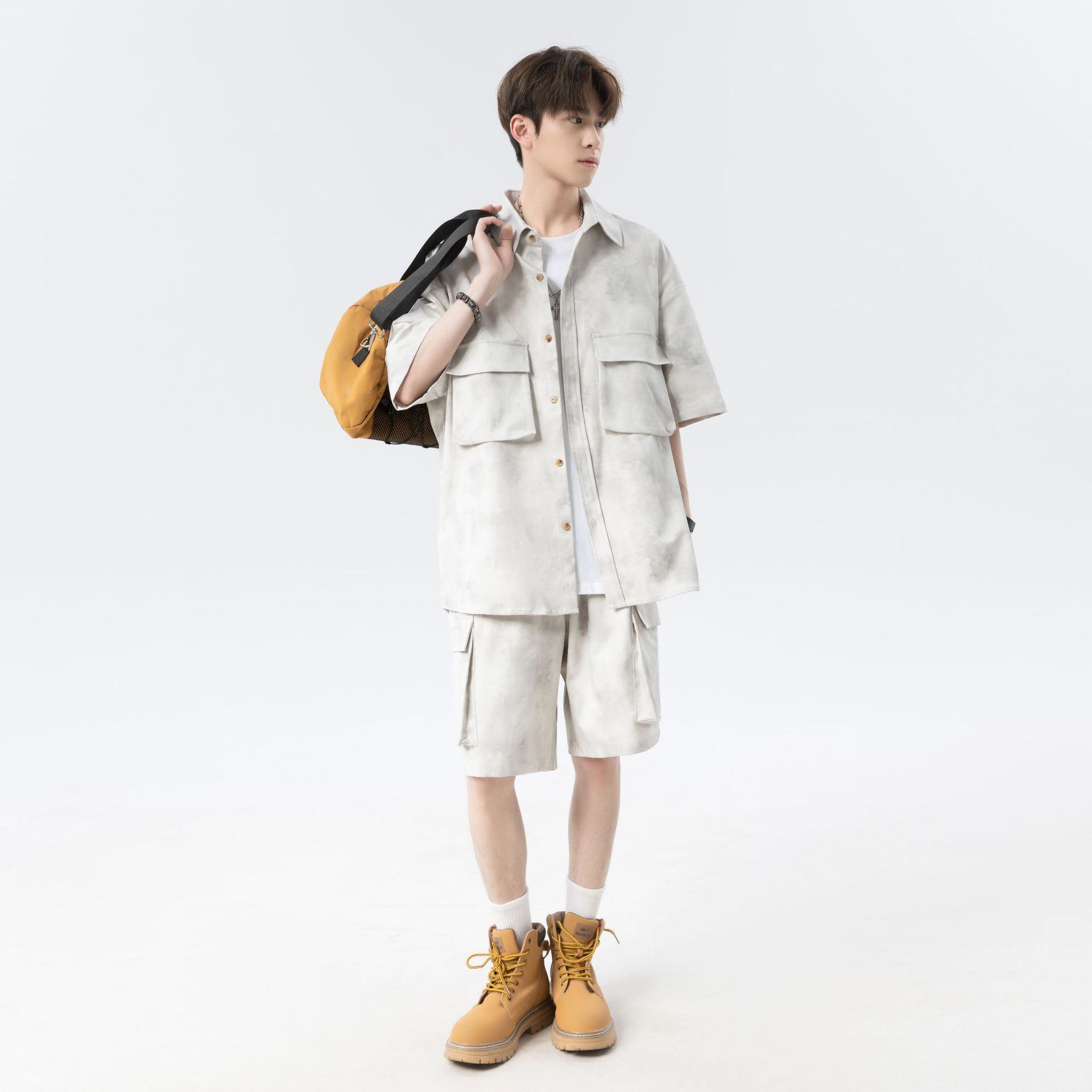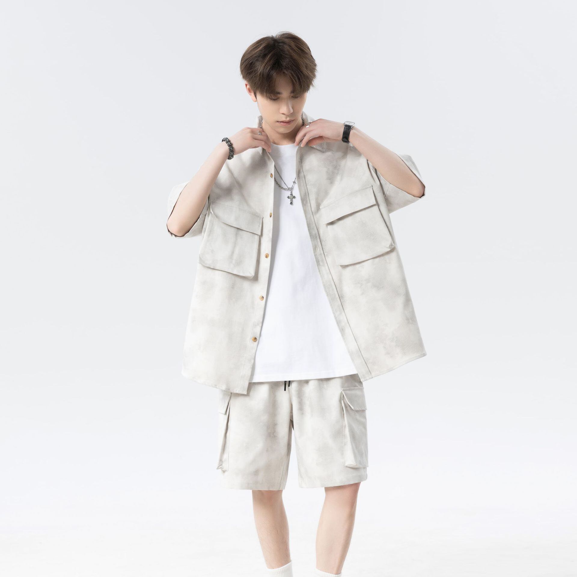 夏染襟半袖シャツパンツ2点セット男性アメリカレトロゆるいカジュアル五分ズボンセット 1019